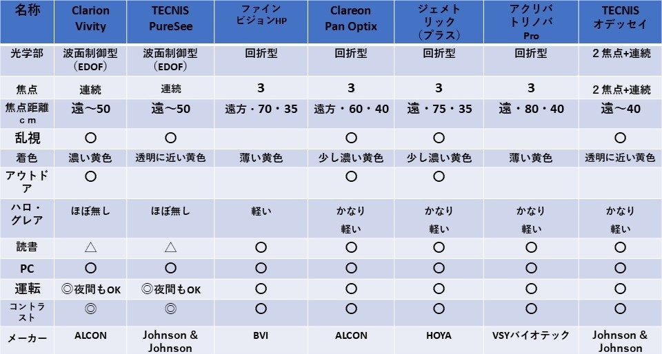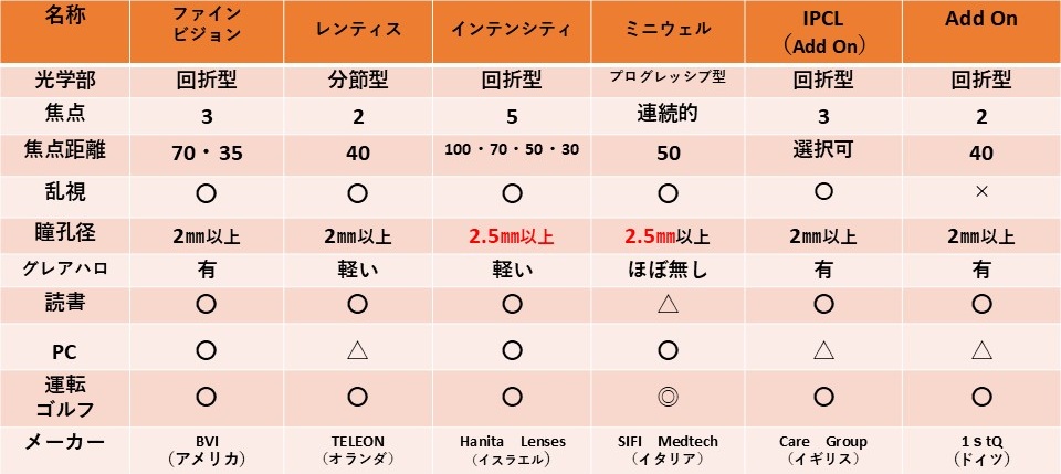 | 光学部 | 分節型 | 回折型 | プログレッシブ型 | 回折型 | 回折型+α |